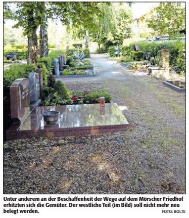Fragen zu diesem Konzept hatten die Gäste kaum. Jedoch hatte sich Unmut aufgestaut ob des Zustands des Gottesackers. „Der Mörscher Friedhof ist der ungepflegteste in der Umgebung“, meinte eine Frau, die für diese Aussage viel Beifall bekam. Die Wege seien bei Regen wegen großer Pfützen schlecht begehbar. Hinter einigen Urnengräbern sei die Erde so hart, dass man sie nicht bearbeiten könne. Unkraut wuchere überall, und einige Menschen vernachlässigten die Grabpflege. Und: Der Friedhof werde nicht mehr abgeschlossen.