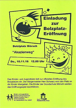 Die offizielle Eröffnung ist am Donnerstag den 10. November 2016, 12.00 Uhr. Der neue Bolzplatz wird durch Bürgermeister Andreas Schwarz eröffnet. Die Kinder der Grundschule Mörsch werden im Anschluss ein Eröffnungsspiel durchführen.