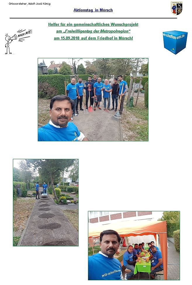 Am Freiwilligentag der bundesweiten Aktionswoche des Bürgerschaftlichen Engagements „Wir schaffen was“ der Metropolregion Rhein-Neckar war auch der Vorort Mörsch beteiligt. Mit einigen Mitbürgern wurde an diesem Tag das anspruchsvolle Vorhaben „Überarbeitung der wassergebundenen Friedhofswege “ in einer 6 stündigen Aktion umgesetzt. Dabei wurde eine große Teilfläche von ca. 800m² im östlichen Teil des Friedhofs bearbeite. Am frühen Nachmittag wurde das 9 köpfige Team (incl. der Mitarbeiter des EWF) durch 8 weitere Helfer der Ahmadiyya-Muslim-Gemeinde aus Frankenthal aktiv unterstützt.