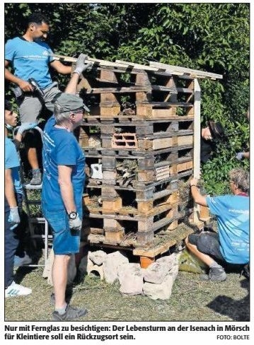 Seit einem Jahr erfreuen sich Spaziergänger entlang der renaturierten Isenach südlich der A6 an einer Wildblumenwiese, die mit Nisthilfen, einem Insektenhotel und Natursteinen die Ansiedlung von Reptilien, Vögeln und Insekten fördert. Der neue Unterschlupf am Bachabschnitt nördlich der Autobahn sei auf Anregung von Frankenthalern entstanden und durch Sach- und Geldspenden von Firmen, Bürgern und der Stadtverwaltung ermöglicht worden.